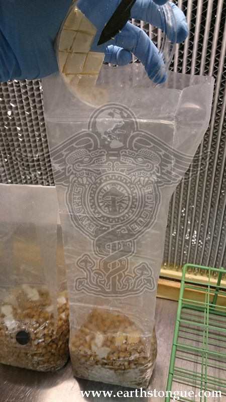 Now that the mycelium is inside the bag, hold the bag shut and shake the contents inside the bag to disperse the agar squares into the grain for an even and fast colonization of your grain.
